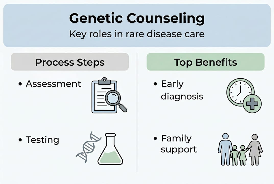 | Genetic counseling defined | Genetic counseling helps families interpret results, assess risks, and plan care for rare diseases. |